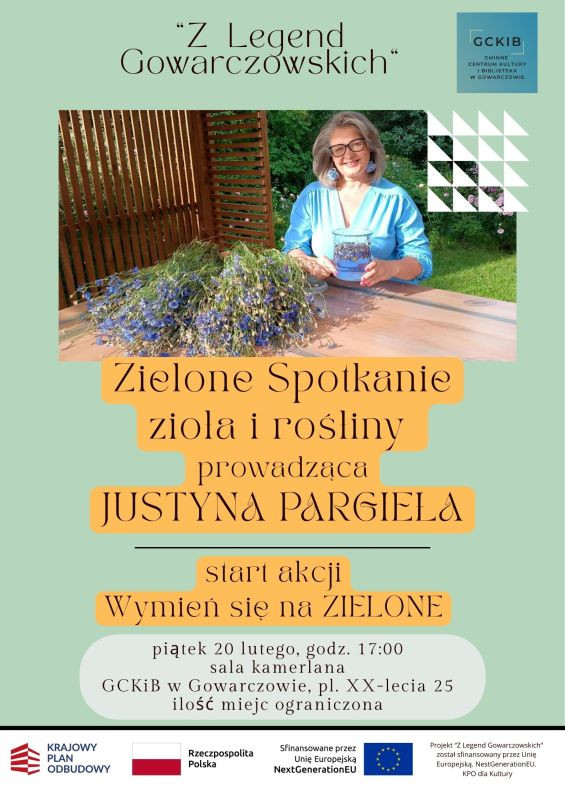 Centrum Kuiltury i Biblioteka w Gowarczowie zapraszają na spotkanie z p. Justyną Pargiełą - zielarką, fitoterapeutką, psychodietetyczką, ekspertką Pytania na Śniadanie, autorką książki "DziczeJemy w kuchni". Prelekcja pt. "Dzika Kuchnia i Apteczka" z pokazem i degustacją zaznajomi uczestników z tematami z zakresu zielarstwa, pielęgnacji roślin, permakultury.