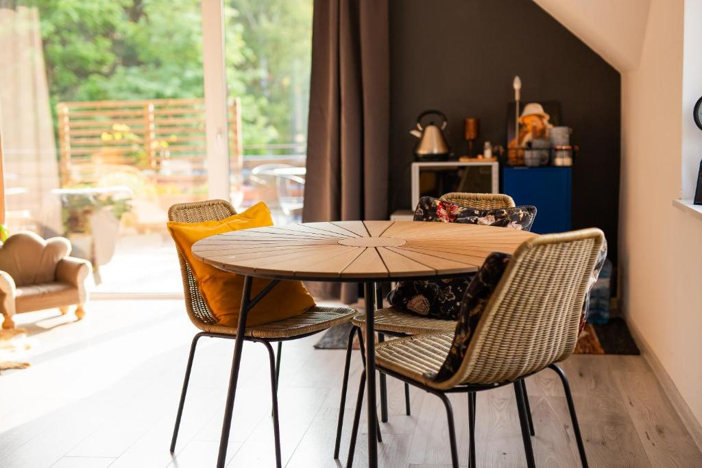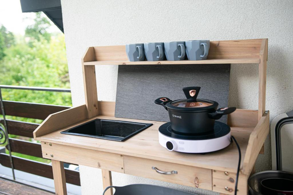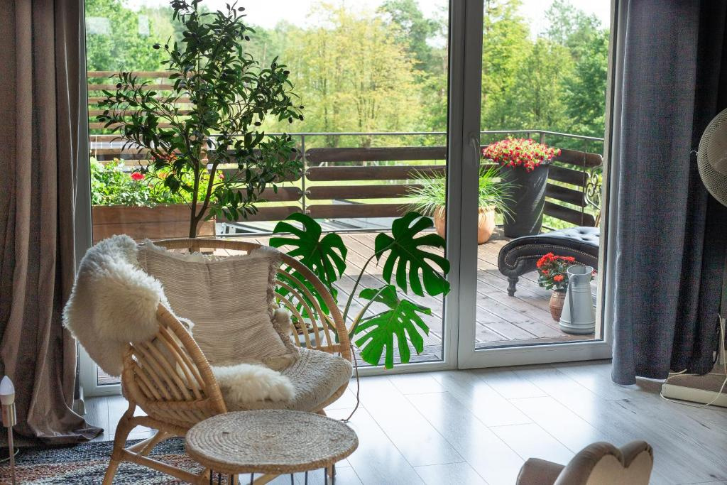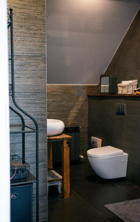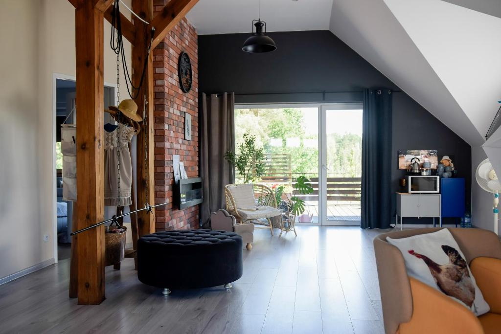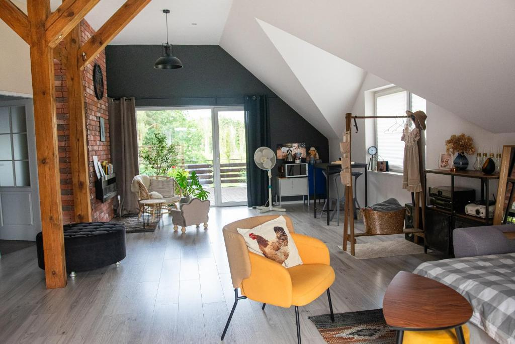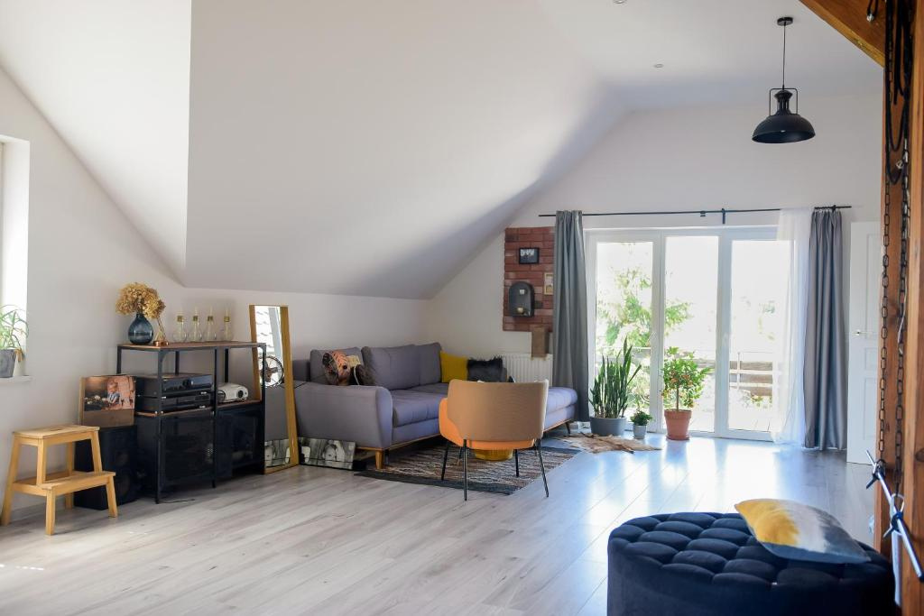 Właścieiele obiektu oferują do wynajęcia cale pierwsze piętro w swoim domu: salon z rozkładanymi łóżkami (z łazienką), z którego są drzwi do sypialni (łącznie 2 pokoje). Do dyspozycji gości są dwa tarasy oraz trzeci na dole, jak również ogród i mały drewniany domek przy rzeczce za domem. W salonie jest mały kącik kuchenny z lodówką, mikrofalą, plytą indukcyjną, czajnikiem.