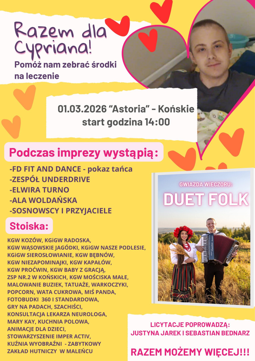 W niedzielę w Sali Bankietowej Astoria w Końskich odbędzie się festyn charytatywny dla Cypriana, chłopca walczącego z nowotworem. Start akcji godz. 14:00. W programie zobaczymy liczne występy artystyczne, licytacje i stoiska gospodyń wiejskich. Szczegóły na plakacie poniżej. Będą m.in.stoiska Kół Gospodyń Wiejskich, popcorn, wata cukrowa, fotobudki 360, wielki miś, gry retro, rozgrywki szachowe, animacje dla dzieci, kuchnia polowa, animacje dla dzieci, kosmetyki Mary Kay, a nawet konsultacje lekarskie.