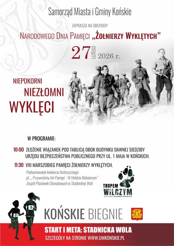 Uroczystości odbędą się w dniu 27 lutego 2026 r. Bieg organizowany jest przez Gminę Końskie w ramach ogólnopolskiego projektu „Tropem Wilczym. Bieg Pamięci Żołnierzy Wyklętych”. Wręczenie medali uczestnikom biegu poprzedzi podsumowanie konkursu historycznego pt. "Przywróćmy Ich Pamięć - W Hołdzie Bohaterom".