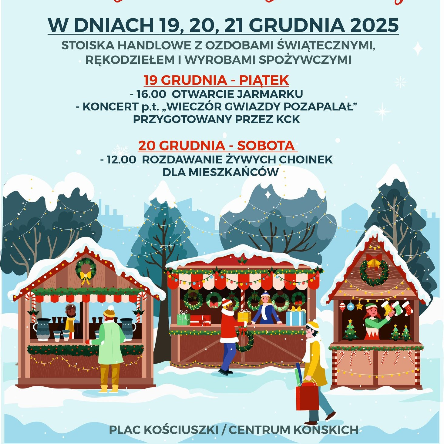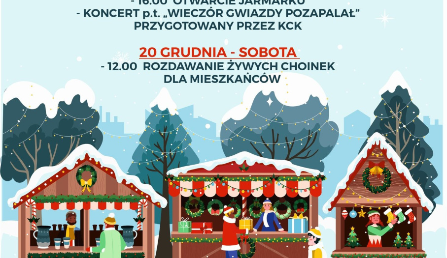W klimat bożonarodzeniowy wprowadzi wszystkich program artystyczny i koncert przygotowany przez pracowników i artystów Koneckiego Centrum Kultury ph. "Wieczór gwiazdy pozapalał", który rozpocznie się w piątek 19 grudnia o godz. 16:00. W sobotę o godz. 12:00 będą rozdawane żywe choinki dla mieszkańców.