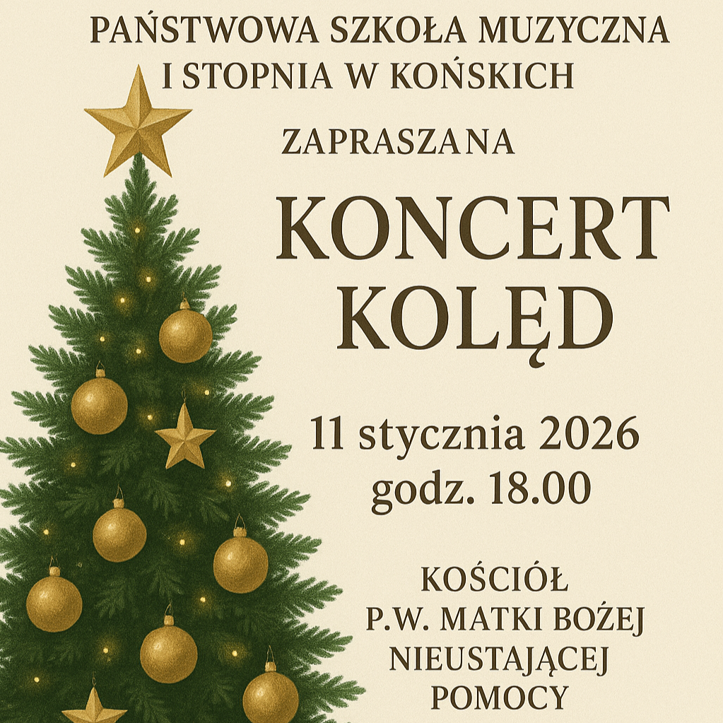 Państwowa Szkoła Muzyczna I stopnia w Końskich zaprasza na koncert kolęd, który odbędzie się w niedzielę 11 stycznia o godz. 18:00. Kolędy zagrają uczniowie w kościele pw. Matki Bożej Nieustającej Pomocy przy ul. Robotniczej 88. Wstęp wolny!