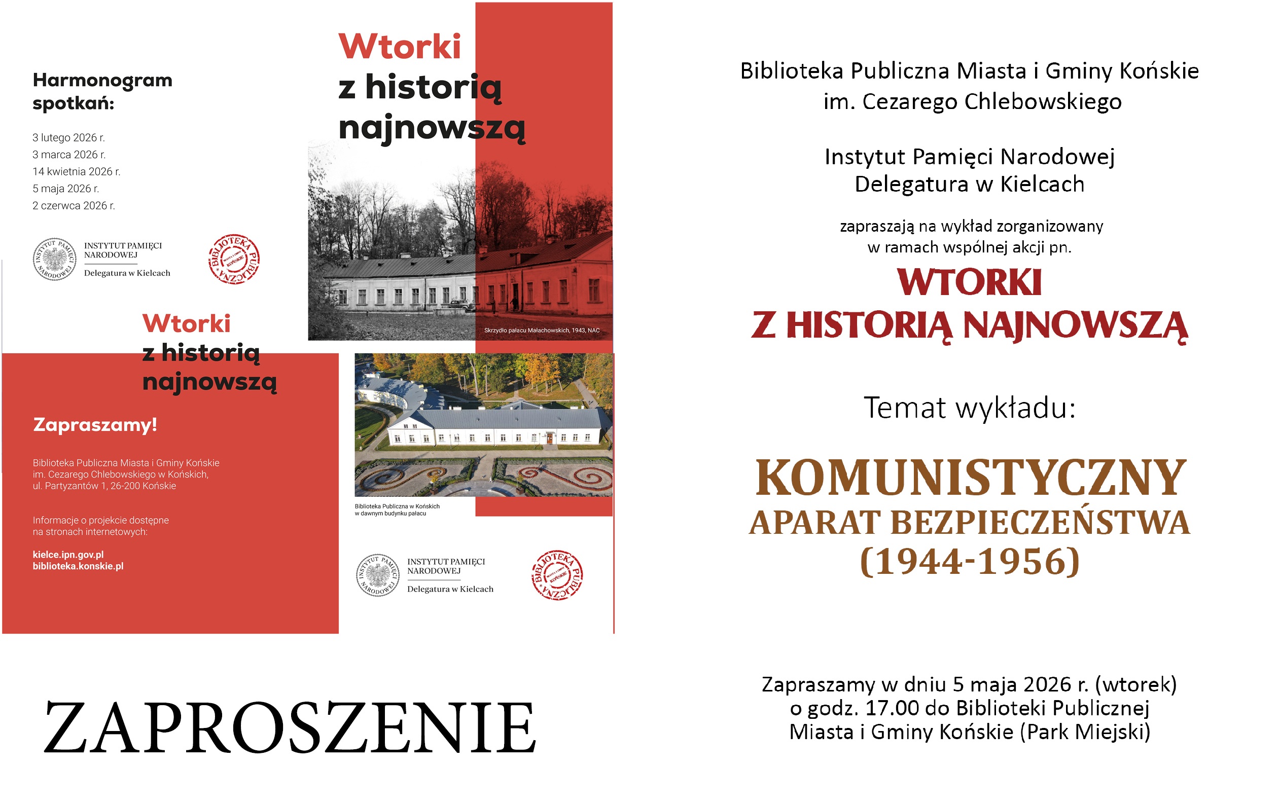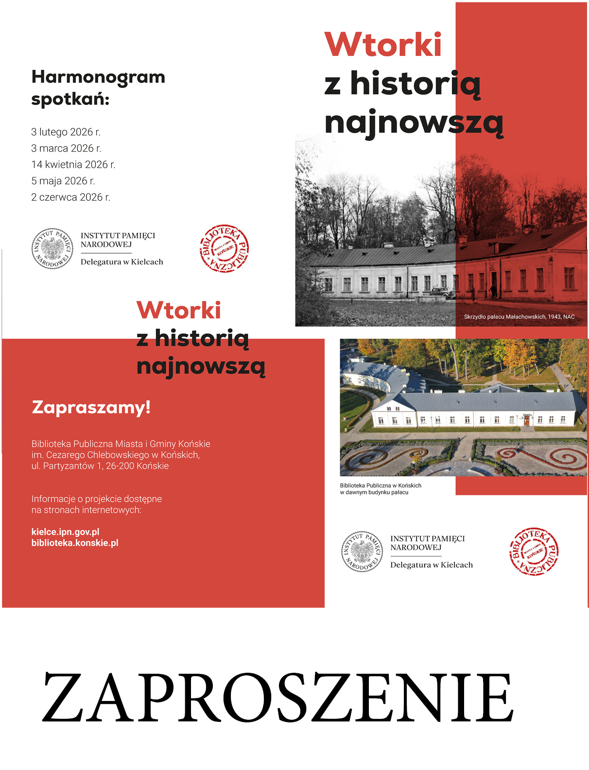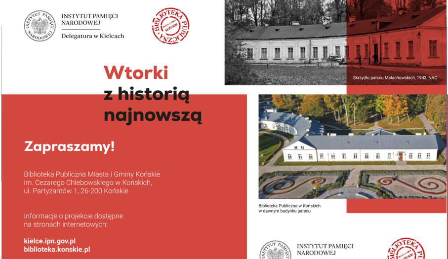 Wtorek z historią najnowszą to wspólna inicjatywa Instytutu Pamięci Narodowej i Biblioteki Publicznej Miasta i Gminy Końskie. Raz w miesiącu odbywają się spotkania edukacyjne dla młodzieży szkolnej oraz ogólnodostępne wykłady z udziałem prelegentów z IPN Delegatury w Kielcach.
